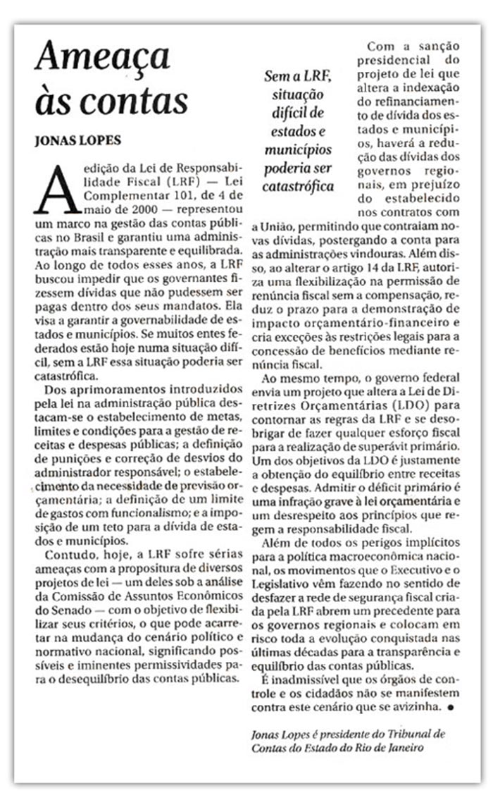 Artigo publicado pelo jornal O Globo. - Conselheiro Jonas Lopes de Carvalho Junior - 27/11/2014